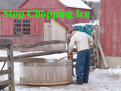Q. - I have your highest power 600 watt model and a big powerful battery at the full 13.8 volt charge but the water still freezes up by morning. What can I do? A - You must be in an extremely cold area. The best thing you can do is get a smaller stock tank to concentrate the heaters energy into a smaller body of water. Also try to bring hot water with you when you fill your stock tank. Many ranchers fill their truck-tank directly from their home hot water heater. This water is burning hot at first but by the time you get out to the stock yard the water will be nice and warm and will melt all of the ice in the tank on contact ! (No Chopping). Now connect your freshly charged battery to your stock tank heater and you should be able to make it for a full 24 hours, until your next visit.